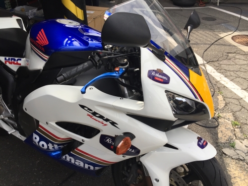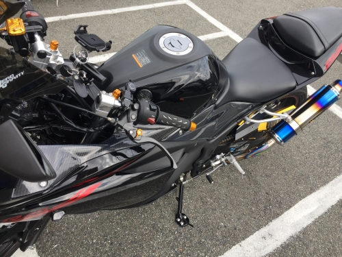 2本出しマフラー装着された迫力のあるR25にツーリングレバーを装着しました。見たことのない色々なパーツが装着されたカスタムR25でした!