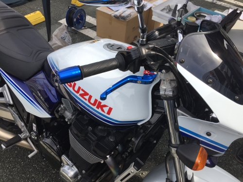ツーリングタイプのチタンカラーにブルーのアジャスターを装着してレバーとバーエンドもスペンサーカラーです。