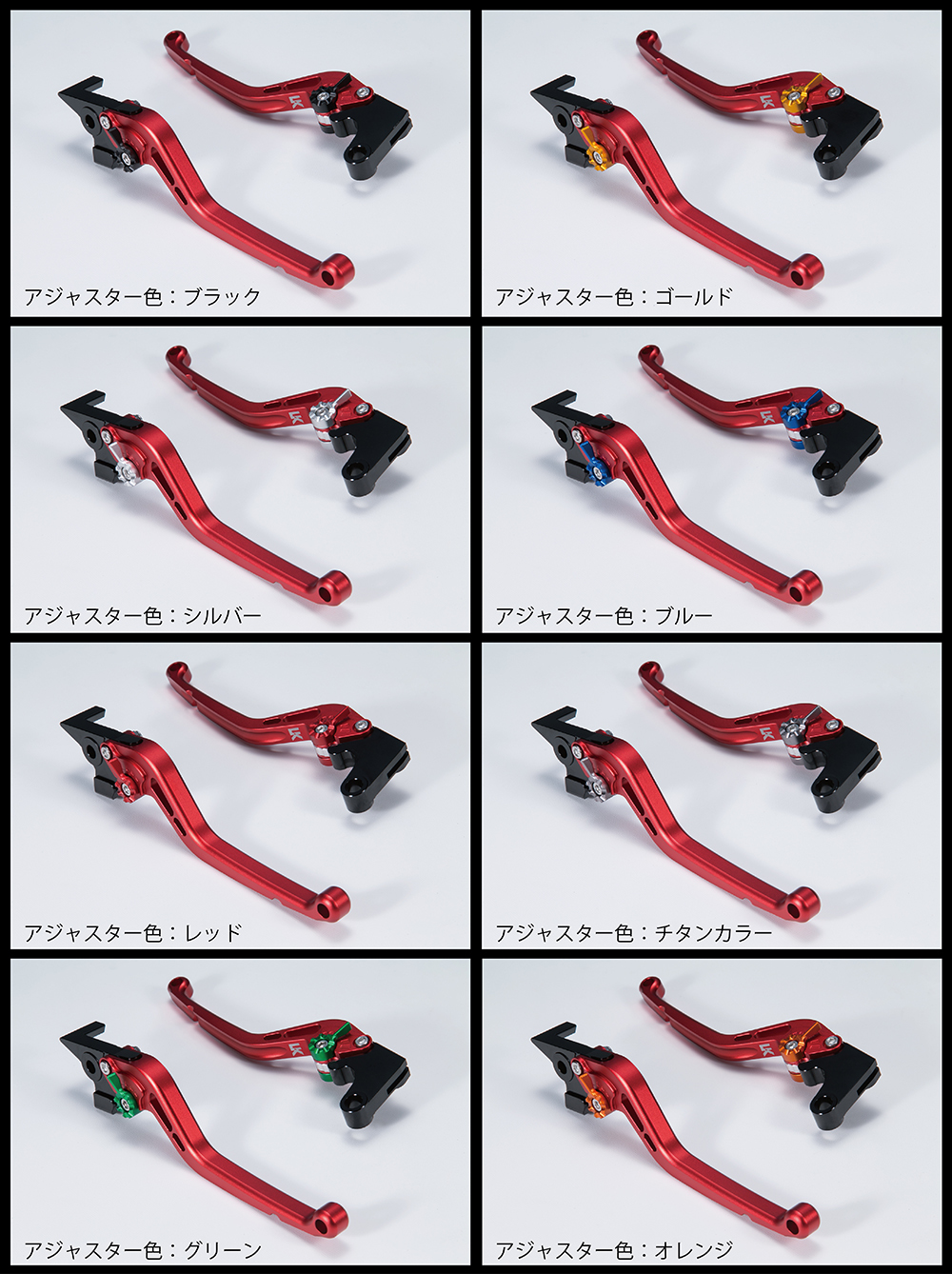 レバー5色×アジャスター8色、合計40種類のカラーバリエーションで愛車のカスタムコーディネートに一役買います。