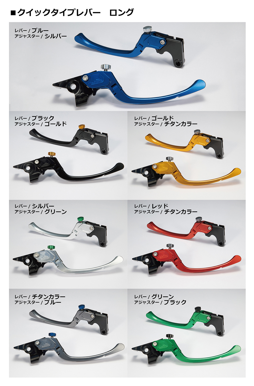 レバー7色×アジャスター7色、合計49種類のカラーバリエーションで愛車のカスタムコーディネートに一役買います。