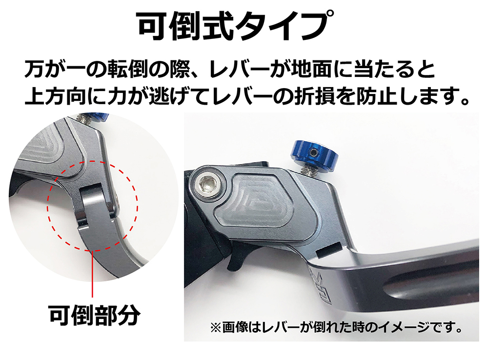 ● 万が一の転倒に可倒機構を備えレバーが地面に当たると上方向に力が逃げてレバーの折損を防止します。